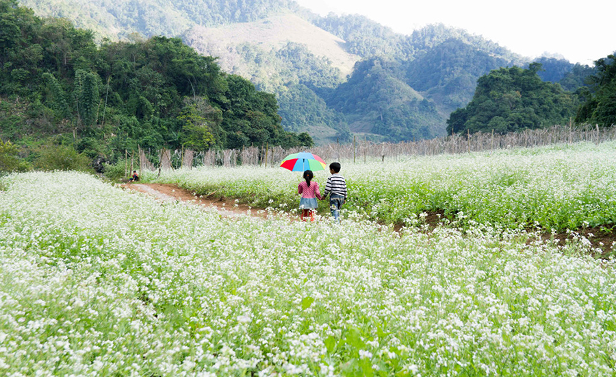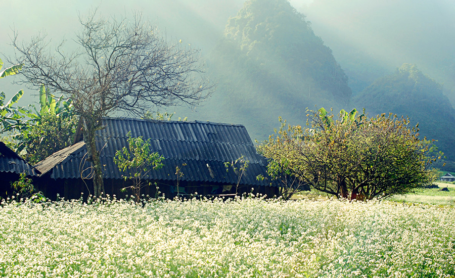 Ai đã một lạc bước Mộc Châu mùa hoa cải mới biết được thế nào là tiên cảnh ở nhân gian. Những cánh đồng cải trắng trải dài khắp thung lũng, vươn lên cả những sườn đồi, bao quanh những ngôi nhà sàn lẻ loi nơi núi rừng Tây Bắc. Cải trắng mọc chẳng chừa lối đi, chạy dài hút theo tầm mắt tạo thành một biển mây trắng muốt, bồng bềnh đẹp ngây người.