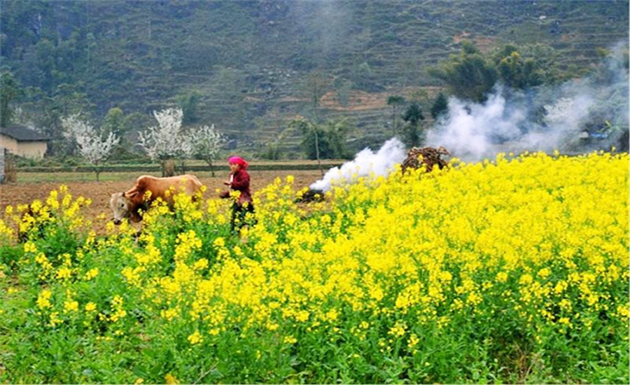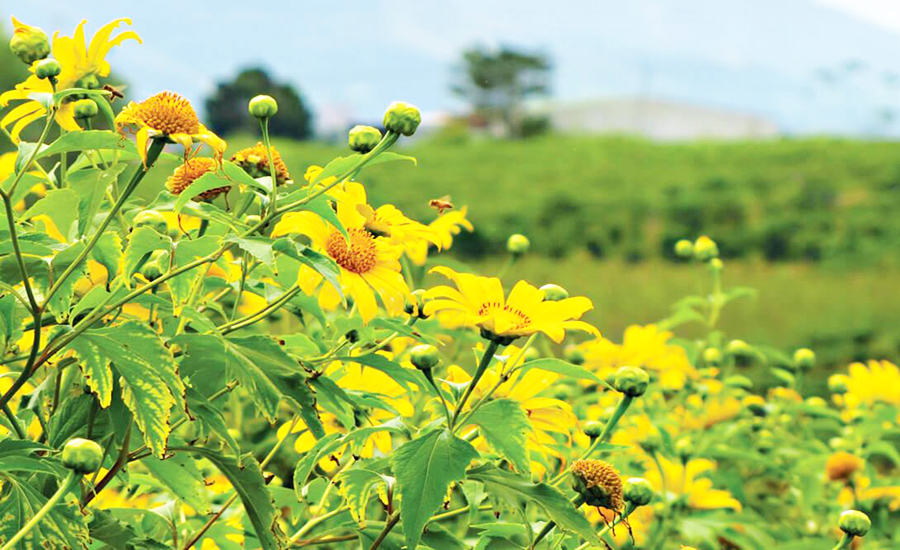 Những hàng rào sắc vàng của hoa dã quỳ, hòa quyện với màu đỏ của hoa trạng nguyên, màu trắng của hoa mận và hoa cải mờ ảo trong làn sương mù tạo nên một khung cảnh đẹp như trong tranh, cảm giác như đang lạc vào xứ sở thần tiên vậy.