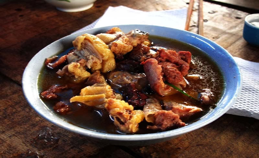Đây là một trong những món ăn thuộc top “kinh dị”, du khách phải có dũng cảm mới dám thử món này. Nguyên liệu để nấu nậm pịa gồm tiết đông, sụn, đuôi, thịt, bạc nhạc, lục phủ ngũ tạng như lòng, dạ dày, gan và phần ruột non có chứa phân non của bò hoặc dê. Ăn miếng đầu tiên thực khách sẽ thấy hơi đắng nhưng từ miếng thứ 2 sẽ dần cảm nhận được vị ngọt từ các loại thịt và có khi lại bị nghiền. Nậm pịa là món khoái khẩu của người vùng cao vào những ngày đông và thường được ăn kèm với hoa chuối, lá bạc hà…