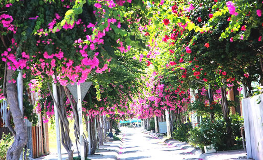 Con đường nhỏ đó nép mình giữa một góc lặng lẽ của Nha Trang và trải đầy hoa giấy đỏ rực giữa ngày hè – Đường Bạch Thái Bưởi. Hoa giấy bắt đầu bung nở vào tháng 3, và bừng sắc rực rỡ khi hoà lẫn vào cái nắng vàng ươm trong tháng 8. Để mỗi đầu hè, những người con Nha Trang thường gọi về nhà hỏi “Hoa giấy đường Thái Bưởi đã nở chưa?”.